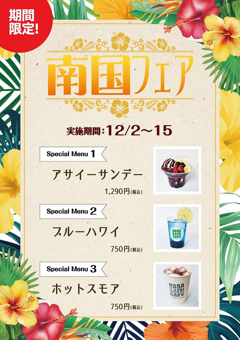 さらに4階ハラカドカフェでは南国フェアスペシャルメニューの提供も実施され、疲れた年末に心も体も元気になるような南国の世界が楽しめます☆