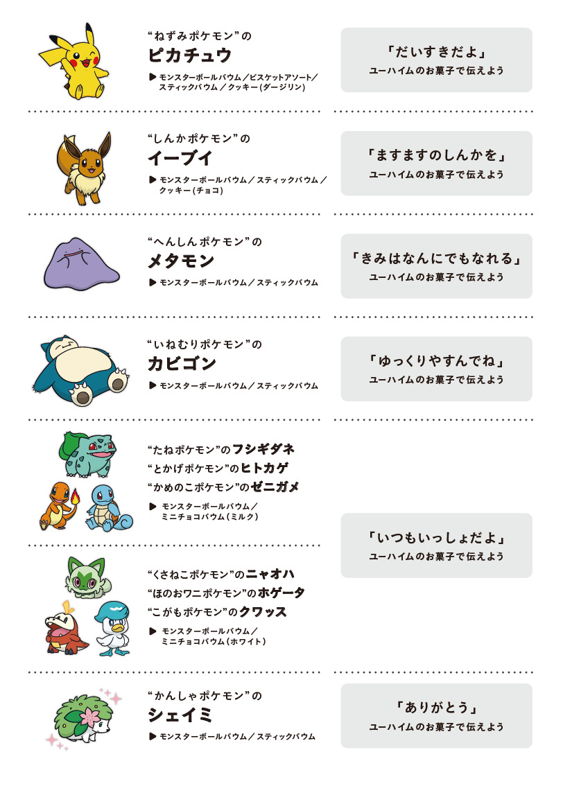 素材の風味が活きたやさしい味のお菓子を手に、個性豊かなポケモンたちとおやつの時間を楽しめるラインナップになっています。