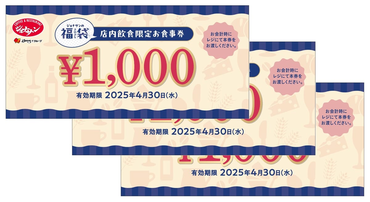 ジョナサンで使える3,000円分のお食事券と共に、福袋には大人かわいいオリジナルデザインのコラボグッズ「スウェットトートバッグ・ミニボトル・ジャガードタオル」の3点をセット。