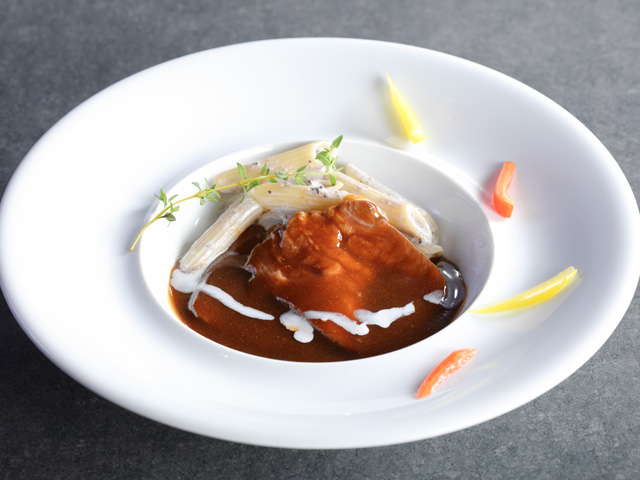 じっくり赤ワインで煮込んだ牛タンをメインにした、柔らかく口の中でほろりとほどける贅沢な味わいに仕上げられた「牛タンのシチュー トリュフペンネ添え」