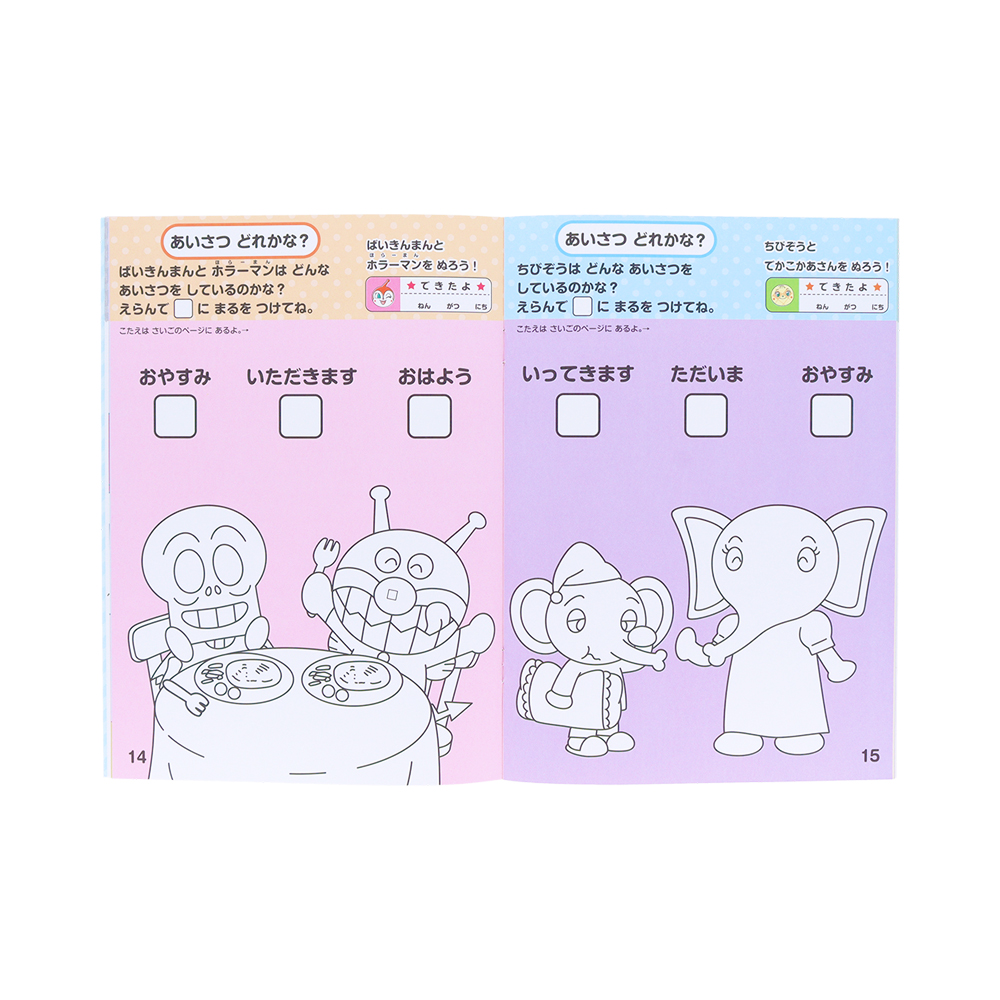 ぬりえを通して、あいさつや季節・時計などが学べる内容。