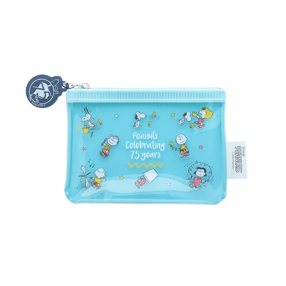 『PEANUTS』の仲間たちがお祝いの準備をしている様子が描かれたミニポーチ。