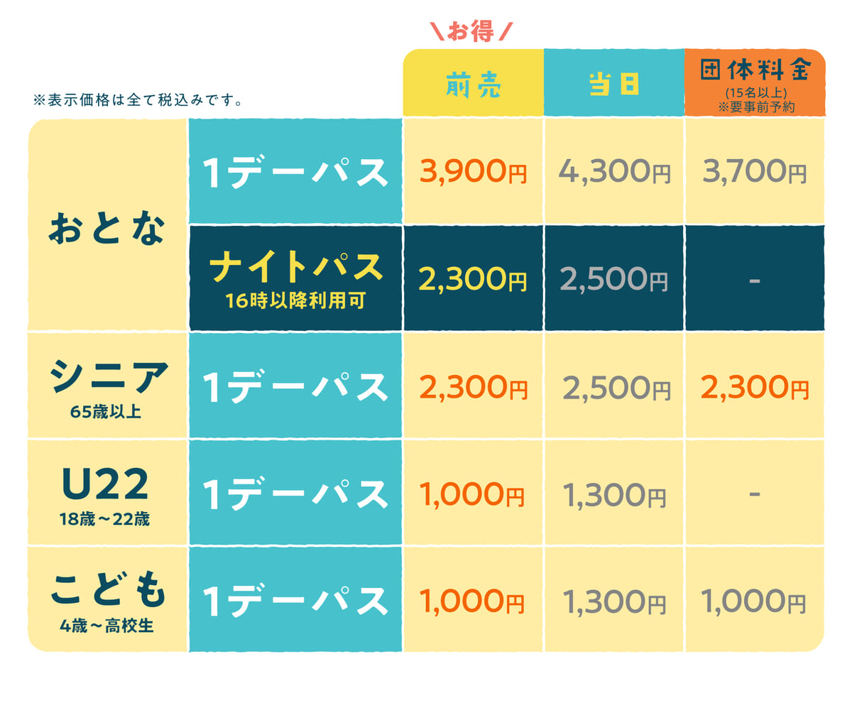 1デーパス(通常価格4,300円)が、前売り1,000円・当日1,300円と、4歳~高校生の1デーパスと同価格で購入でき、ムーミンバレーパークをお得に楽しめます☆