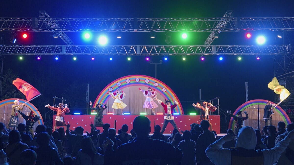 「夕日の丘商店街」を飛び出した住人たちによるハチャメチャなライブ「夕日の丘ライブ!」が、ド派手な照明や演出を加えた「夕日の丘ライブ!ウィンター・カラフルパーティ」になって登場。