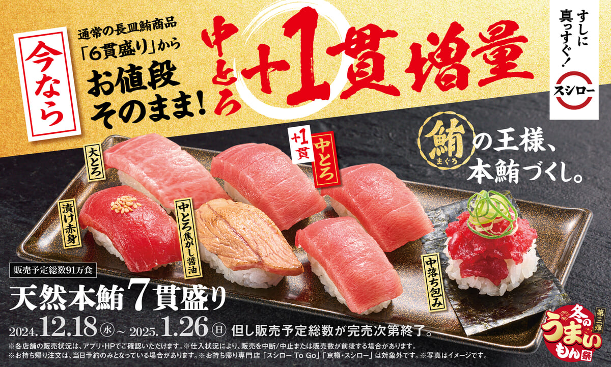 そんな「スシロー」で、通常の長皿鮪商品「6貫盛り」から中とろが1貫プラスで楽しめる天然本鮪の盛り合わせに加えて、“豪華ネタ”や“大切りネタ”が登場する「冬のうまいもん祭 第3弾」が始まります!