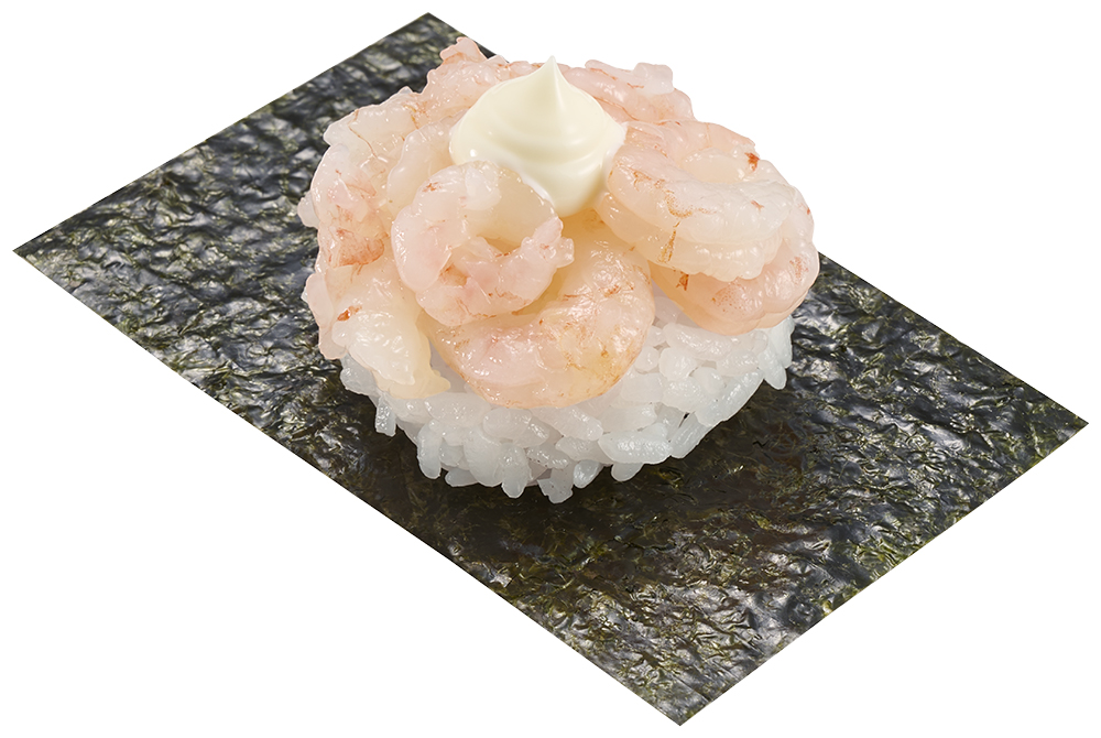 ねっとりとした食感と甘みが特長の甘えびにマヨソースがトッピングしてあります。