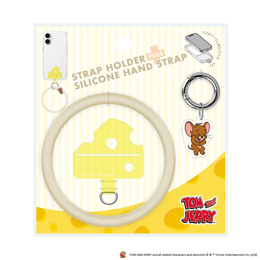 スマホとケースの間に挟み込むストラップホルダーは、「ジェリー」と同じチーズの形をしています。