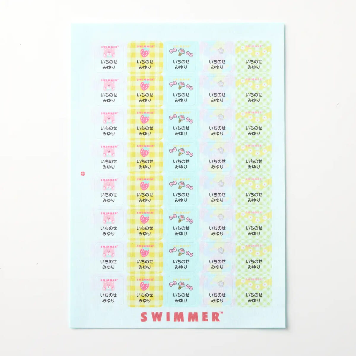 スイマーのカラフルでかわいらしいデザインが気持ちを明るくしてくれる、お名前つけ作業も楽しくなりそうなイラストもポイントです☆