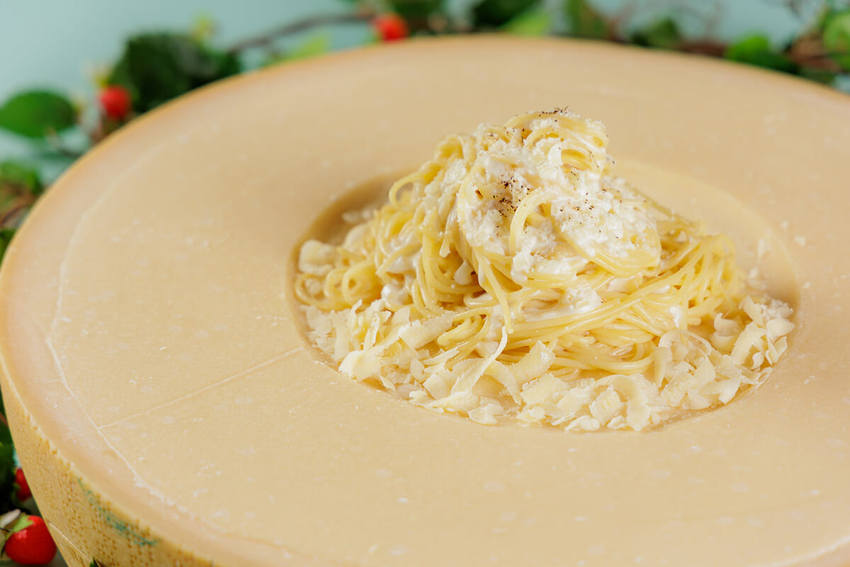ライブキッチンでは、大きなパルメザンチーズのブロックを使って仕上げるクリームパスタを、ゲストの目の前で調理。