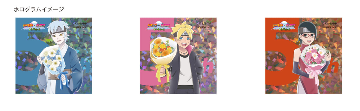 第1弾・第2弾より登場している5周年お祝いメッセージボードに、第3弾描きおろしイラストの「うずまきボルト」「うちはサラダ」「ミツキ」が追加で登場。