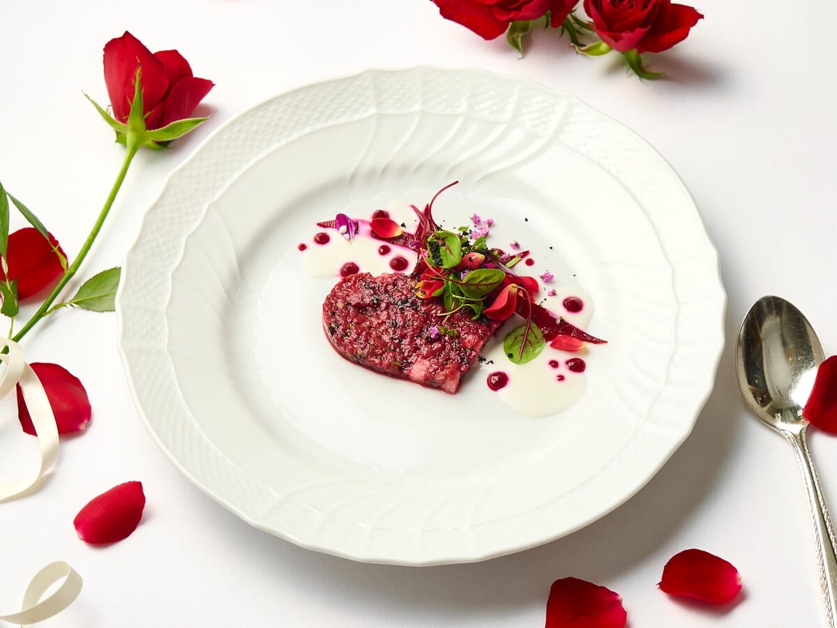 シェフ 吉田 道昭がバレンタインに贈るメニューには、ハートを模った可憐な一皿「馬肉のタルタラ」が登場します。