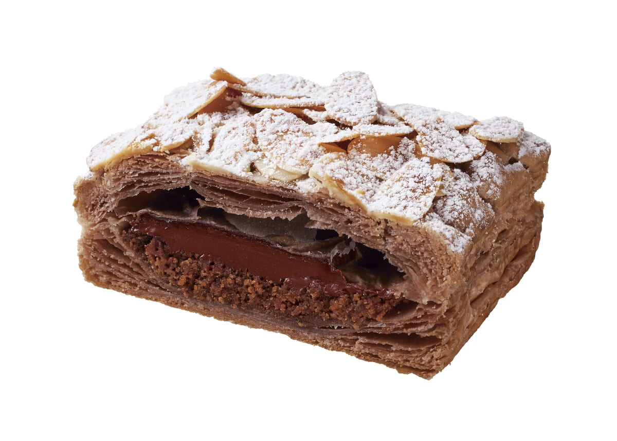 サクサクとしたショコラパイに、クランベリー入りのしっとりとしたアーモンドチョコクリームとビターでフルーティなチョコレートをサンドした「ショコラ ダマンド」