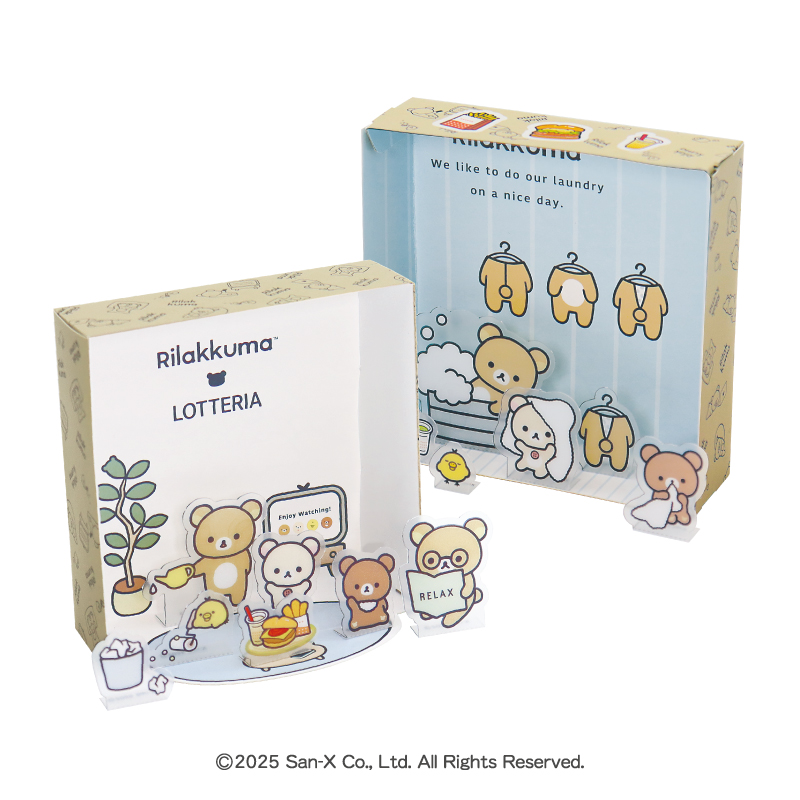 「リラックマ」たちの好きなアイテムやロッテリアのメニューなど、たくさんのキャラクターパーツが付いた箱型のジオラマ。