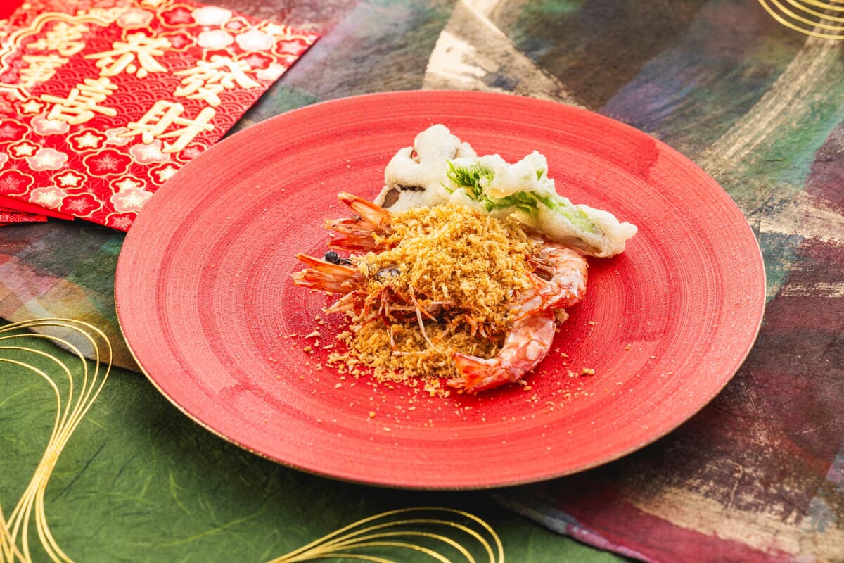 「車海老の香味パウダー仕立て」は縁起物とされる海老を香味パウダーで大胆に仕上げ、甘みと香ばしさ、スパイシーさが調和したメニュー。