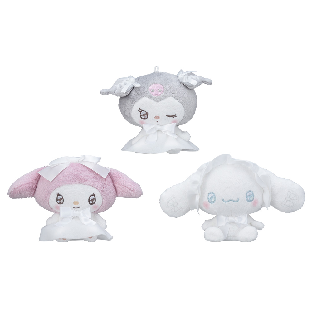 千鳥格子や真っ白な衣装を着こなした「サンリオキャラクターズ」のゆるかわなぬいぐるみとマスコット。
