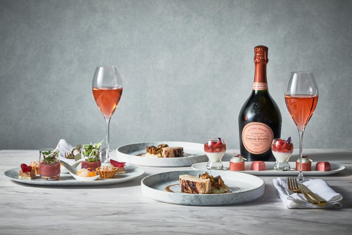 さらに、ロゼシャンパン『ローラン・ペリエ ロゼ』とのペアリングが、ピンク色の泡とともに特別なひとときを演出。