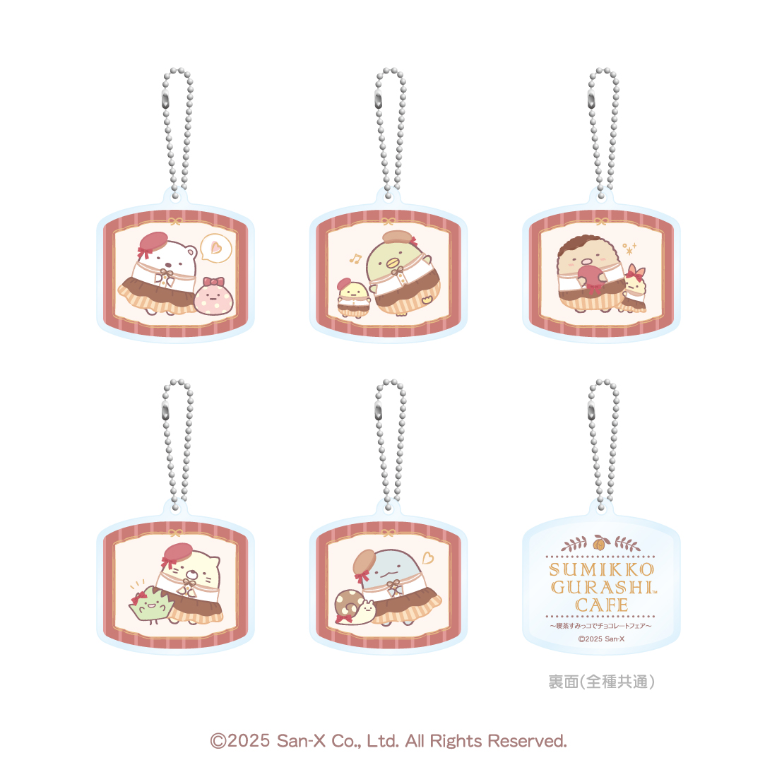 今回の「喫茶すみっコ」のおしゃれな衣装に身を包んだ「すみっコ」たちのアクリルキーホルダー。