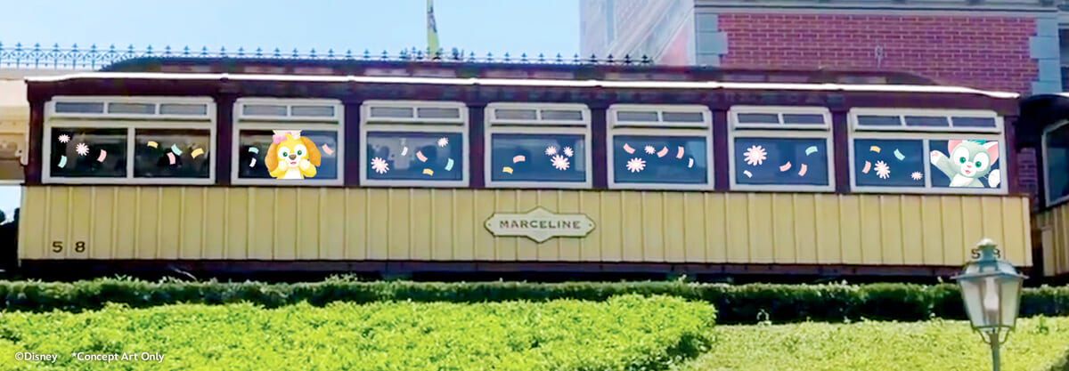 まるで電車から顔を出し、みんなで旅をしているかのような「ダッフィー&フレンズ」を車の外から見ることができます。