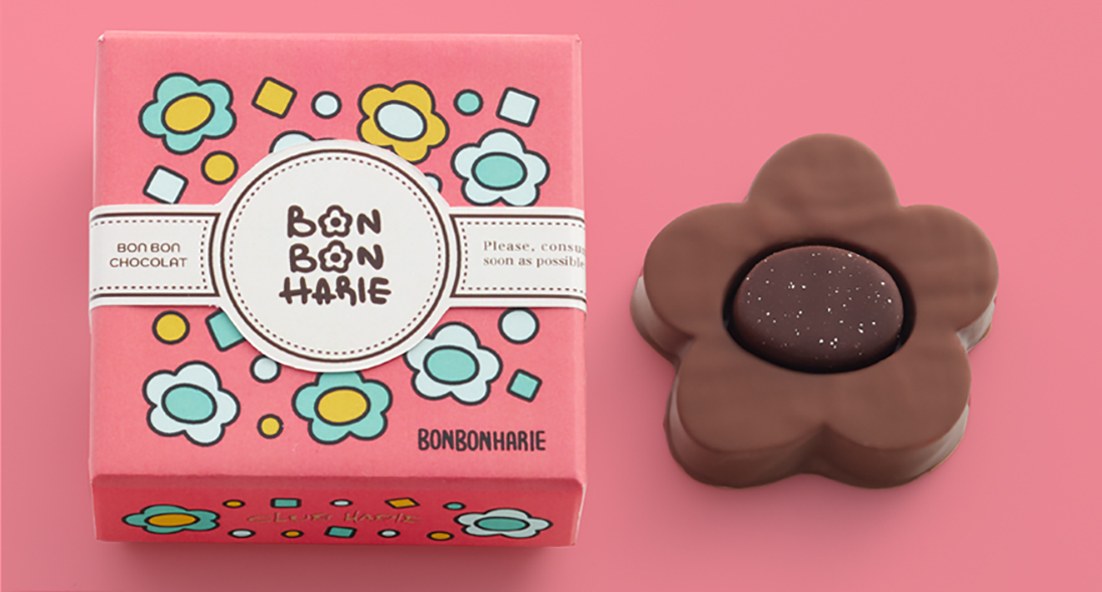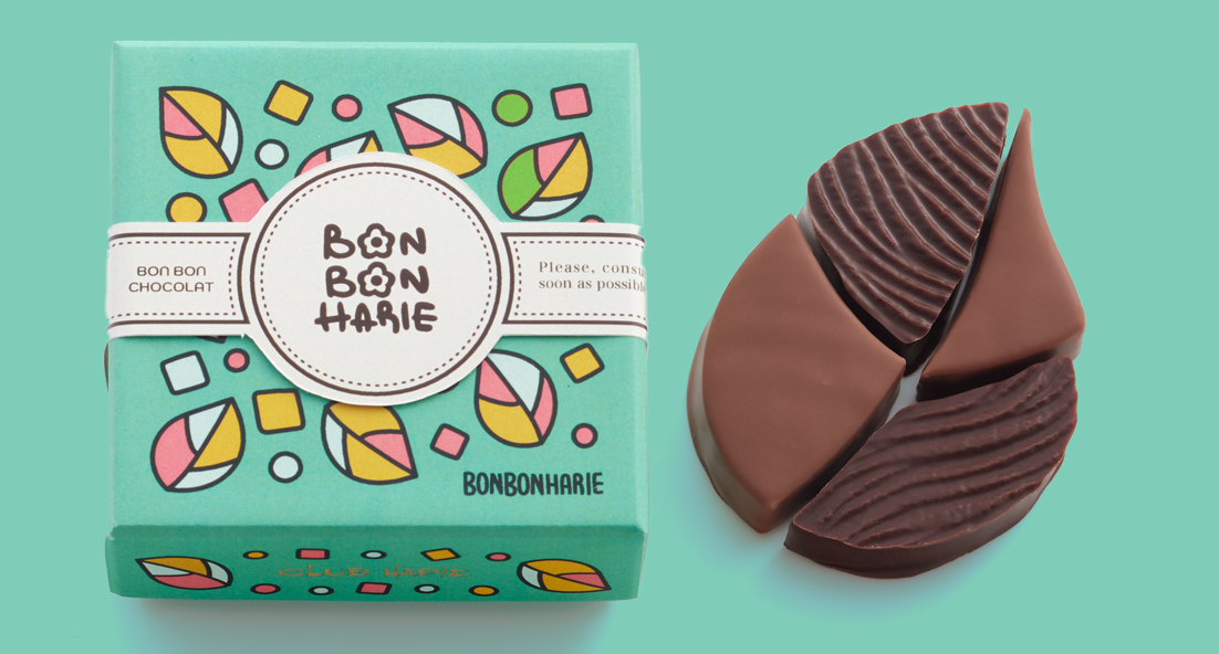 「BON BON HARIE」で展開する、ボンボンショコラの形やパッケージデザインを⼿掛けたのは、イラストレーター くぜさえさん。