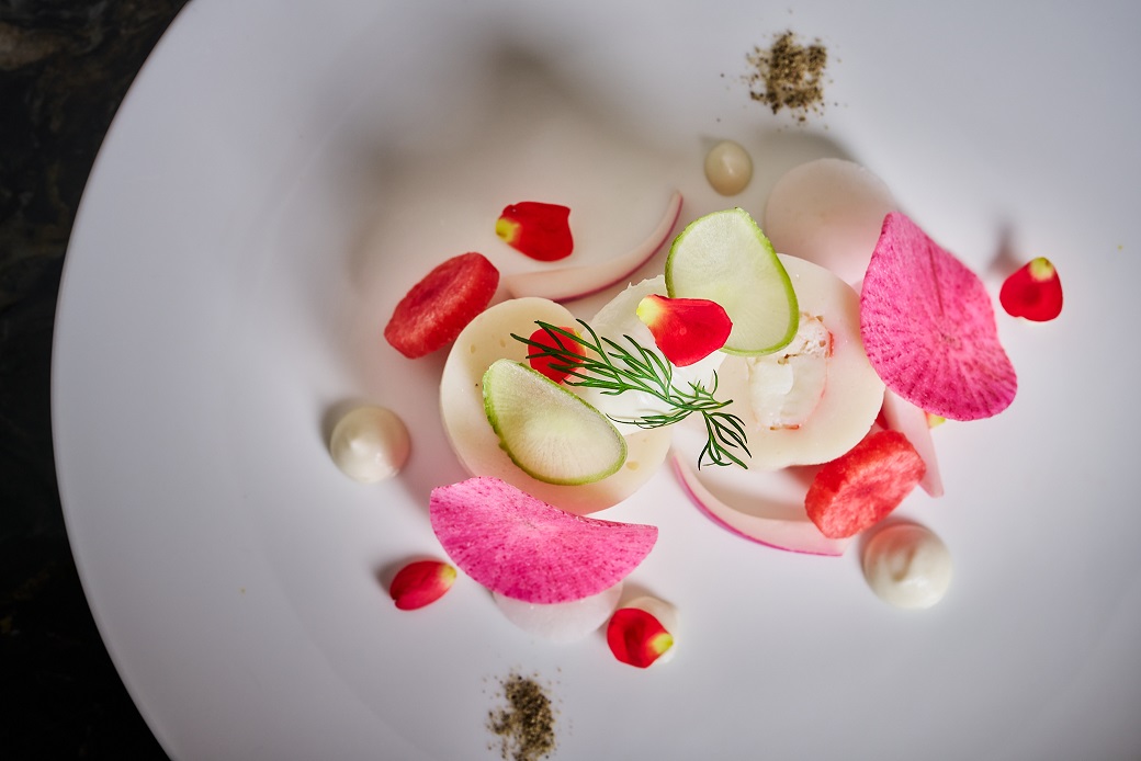 ・ズワイ蟹とホタテのムース(大根と紫玉ねぎのピクルス、オリーブパウダー、塩麹ドレッシング)