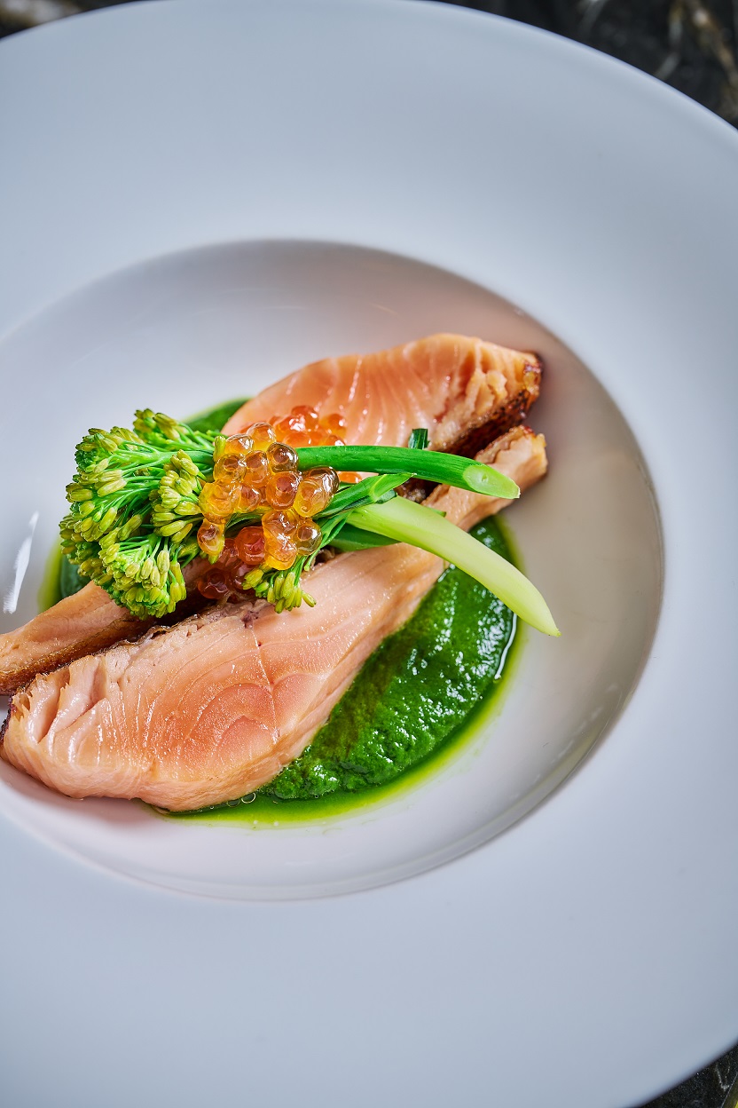 ・タスマニアサーモンのソテー(菜の花、イクラ、柚子風味のブールブラン)