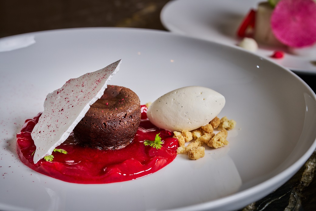 ・チョコレートフォンダン(ラズベリーコンポート、アニススイート、アーモンドクランブル、バニラアイス)