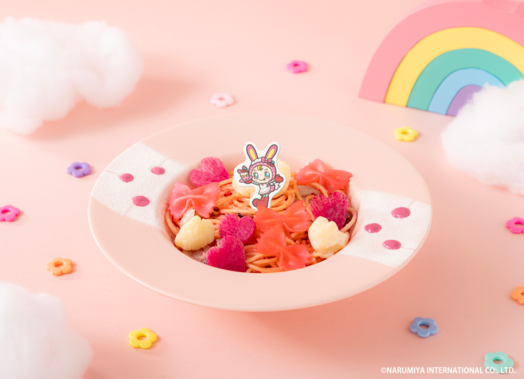 「ベリエちゃん」をのせた、ピンクカラーのたらこクリームパスタ。