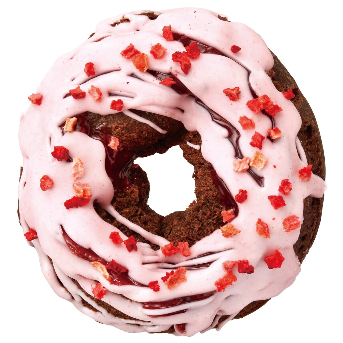 カカオの風味豊かなオールドファッション生地に、フルーティーなチェリーソースを合わせ、ストロベリーコーティングを重ねた「チェリー チョコレートケーキ」