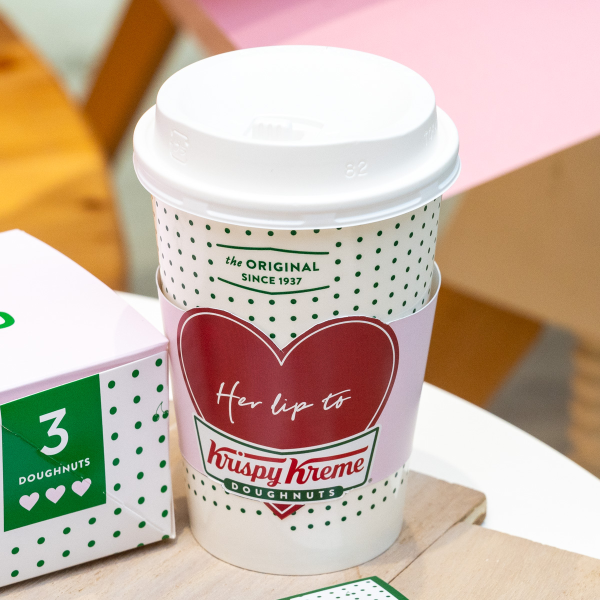 クリスピー・クリーム・ドーナツのデザインと「Her lip to」のチェリー柄を融合したコラボロゴが大きくあしらわれています。