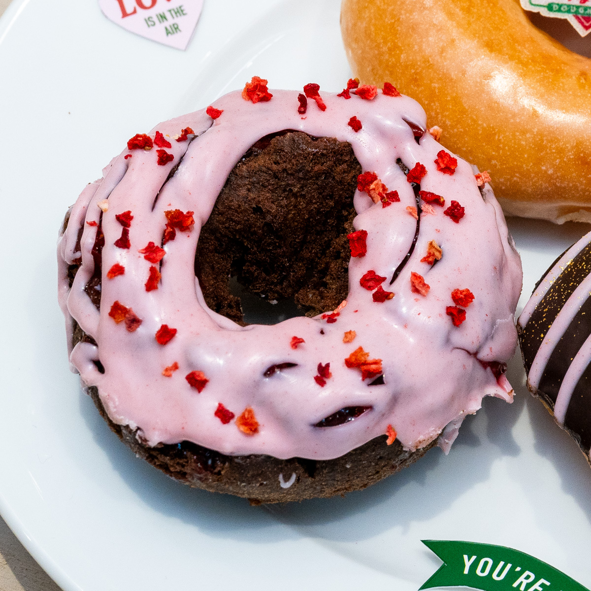 チェリーやストロベリーでピンクに彩ったドーナツと、コラボロゴをあしらった「オリジナル・グレーズド」がセットになった、コラボ限定メニュー。
