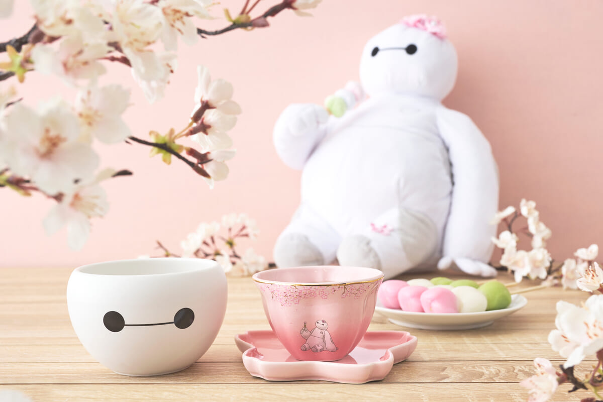 満開の桜の下で桜の花束を持ってウキウキしている「くまのプーさん」と、お団子を片手にほっこりしている「ベイマックス」の描き起こしアートを使用したグッズが展開されます。