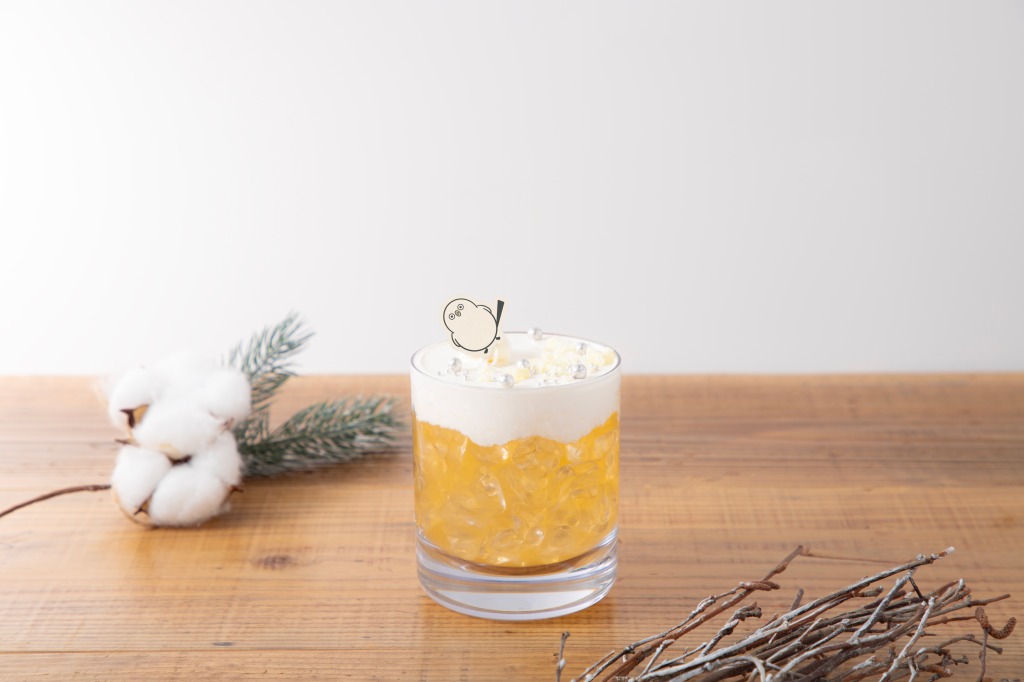 「シマエナガちゃん」がスケートでつるつる転んじゃったシーンを切り取った、ユニークなドリンク。