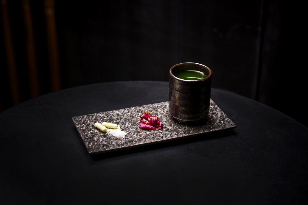 ロングアイランドアイスティーを和の食卓風にツイストし、柴漬けと抹茶シュガーを添えて用意する「After Granpa's Meal」