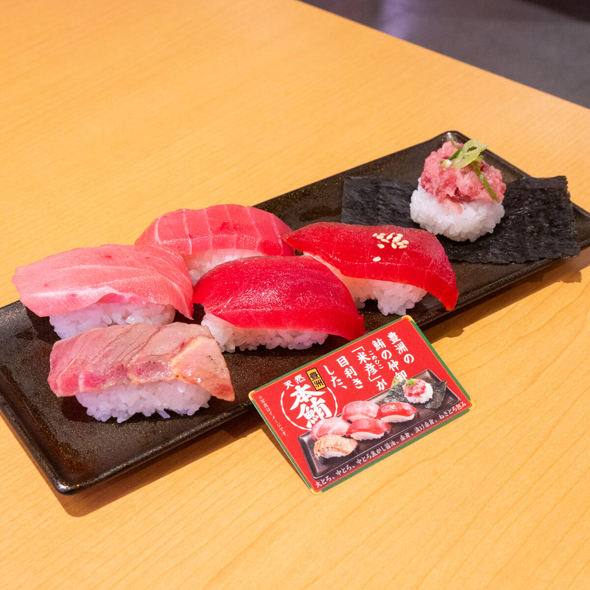 内容:大とろ、中とろ、ねぎとろ包み、中とろ焦がし醤油、赤身、漬け赤身(煮切り醤油)