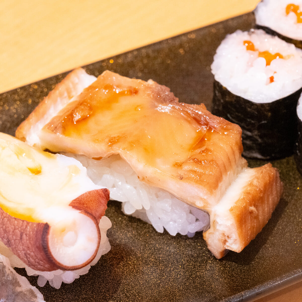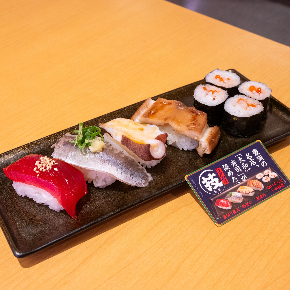 塩いくらのコクと塩味が合う「塩いくらといかの細巻」と、江戸前すし5種が楽しめます。