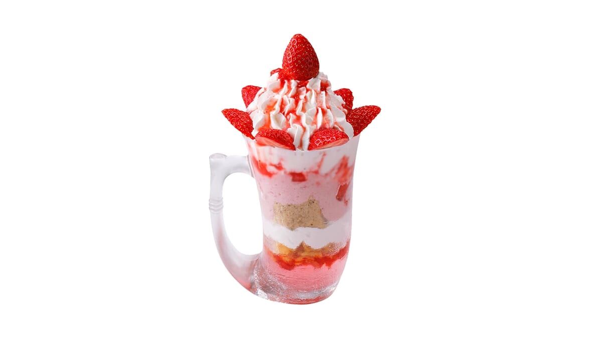 完熟いちご、北海道ソフトクリーム、シフォンケーキ、マスカルポーネいちごクリームなどを贅沢に使用した「ジョッキパフェ(いちご)」