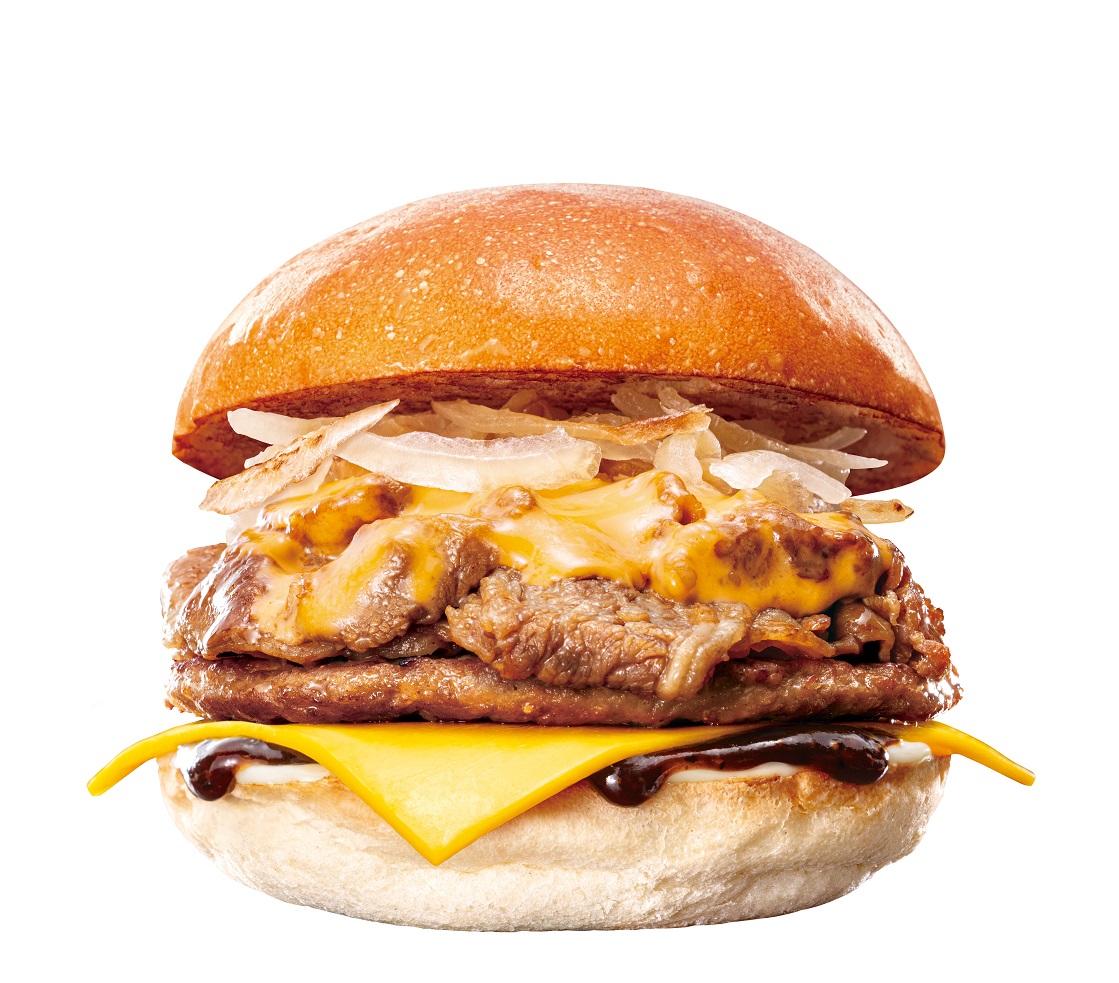 「フィリーチーズステーキバーガー」は、ハンバーグパティに、甘辛く味付けした牛カルビ肉ととろ~り濃厚なレッドチェダーチーズソースやシャキシャキ食感のグリルドオニオンを合わせたメニュー。