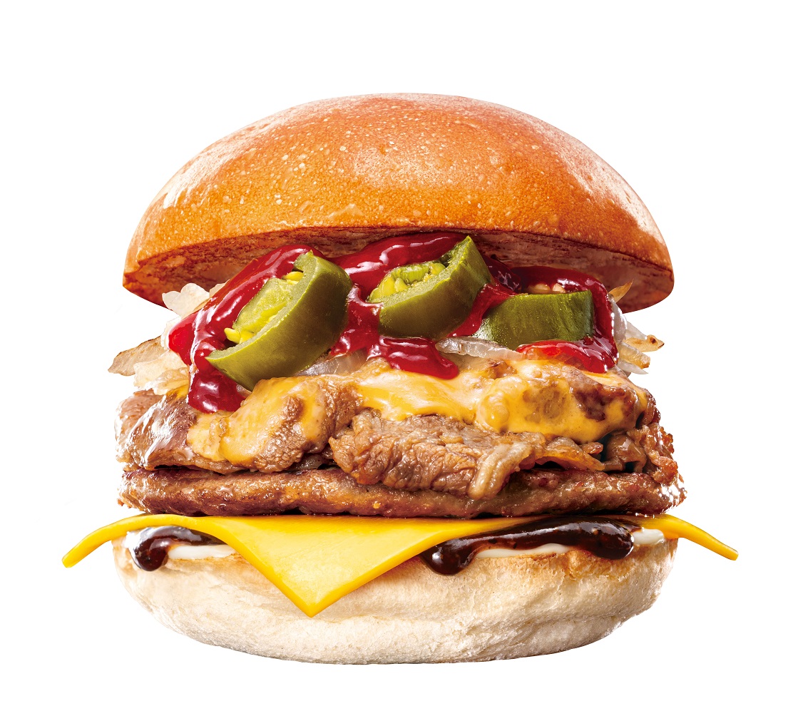 「フィリーチーズステーキバーガー」に、ピリッとした辛みが特長のハラペーニョと特製旨辛ソースを合わせた「スパイシー フィリーチーズステーキバーガー」