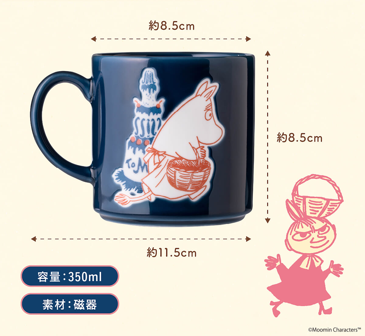 「ムーミンショップ パティスリー」らしい、深いネイビーが大人かわいいオリジナルデザインのマグカップです。