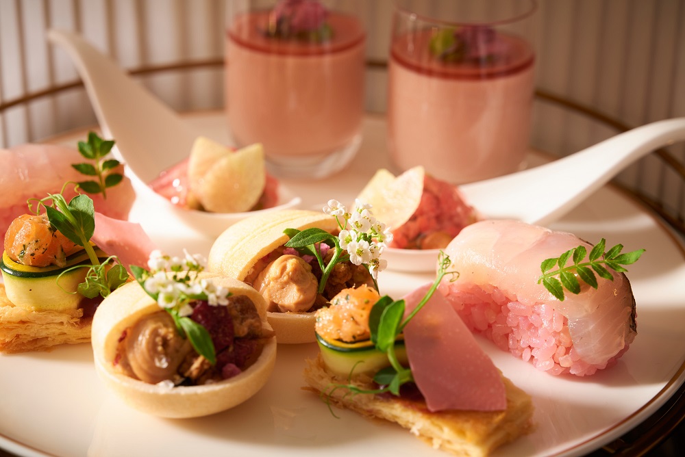 セイボリーには春子鯛の旨味が引き立つ「桜昆布寿司」や桜海老と卯の花を使った「和のタルト」、西京味噌に漬け込んだクリームチーズなど、料理長 天田内が趣向を凝らした品々がラインナップ。