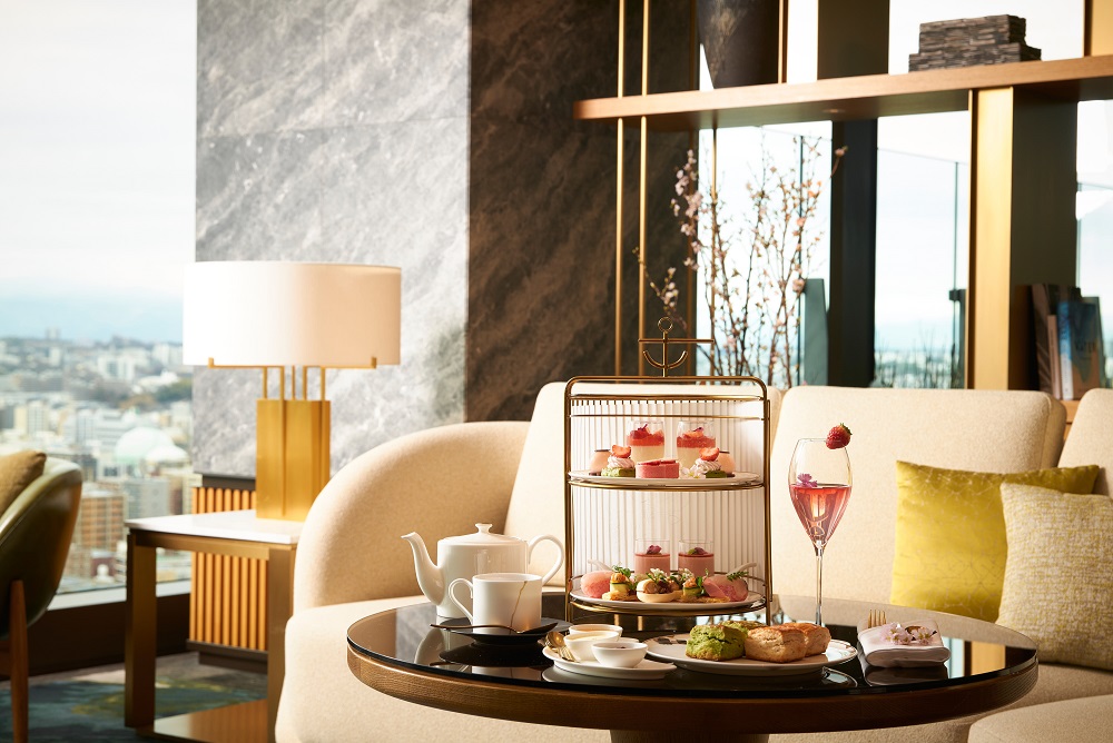 最上階23階から横浜の美景を望む「ロビーラウンジ」では、心躍る麗らかな季節にふさわしい「桜と苺のアフタヌーンティー」を提供。