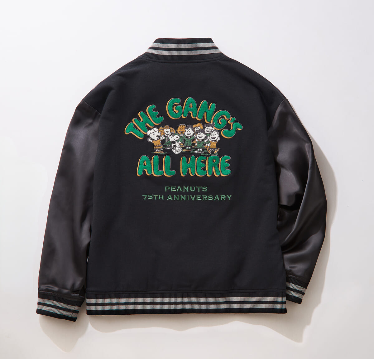 背中にPEANUTSの仲間たちが集合した、ベルメゾンオリジナルの75周年記念アートデザインを使ったスタジャン。