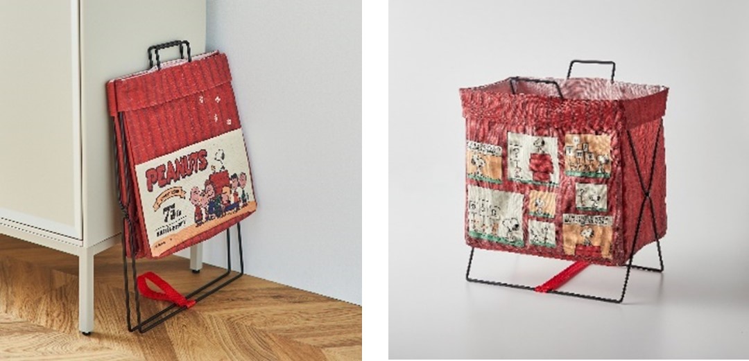 コミックのワンシーンと、ピーナッツの仲間たちを描いた収納スタンドバスケット。