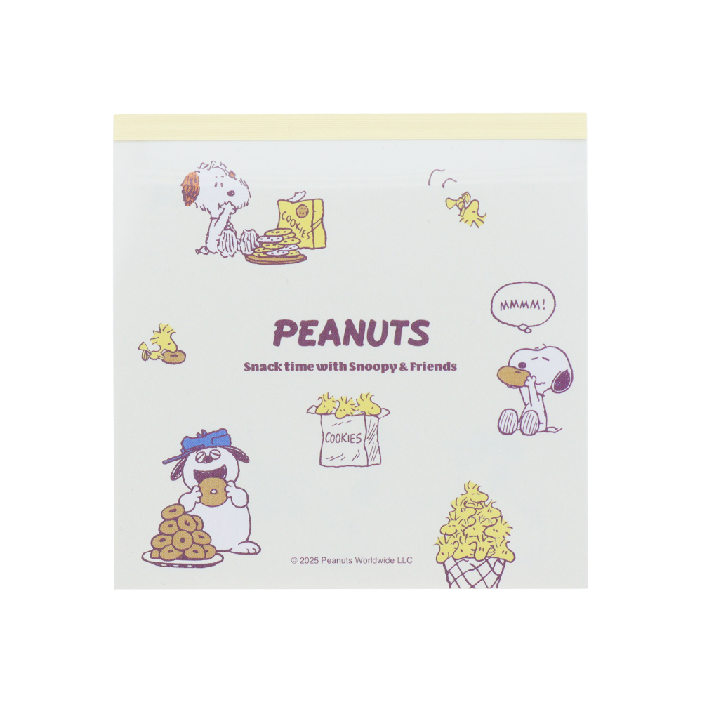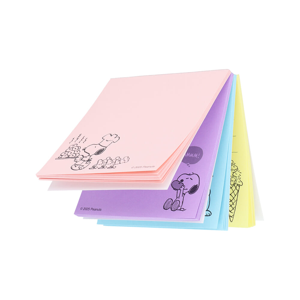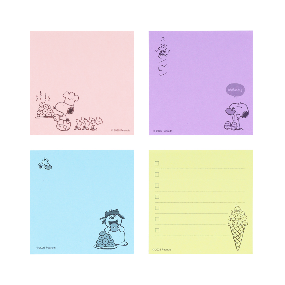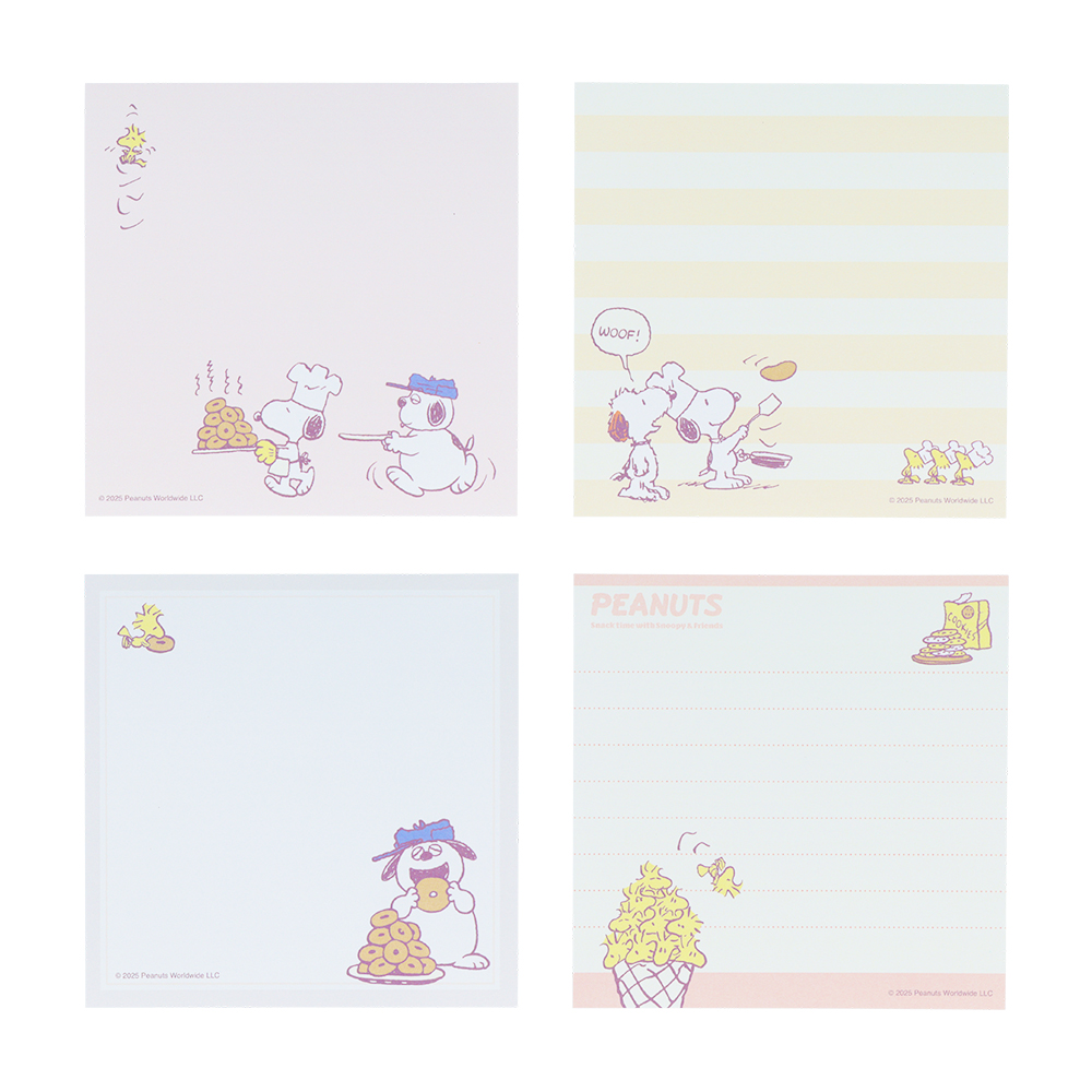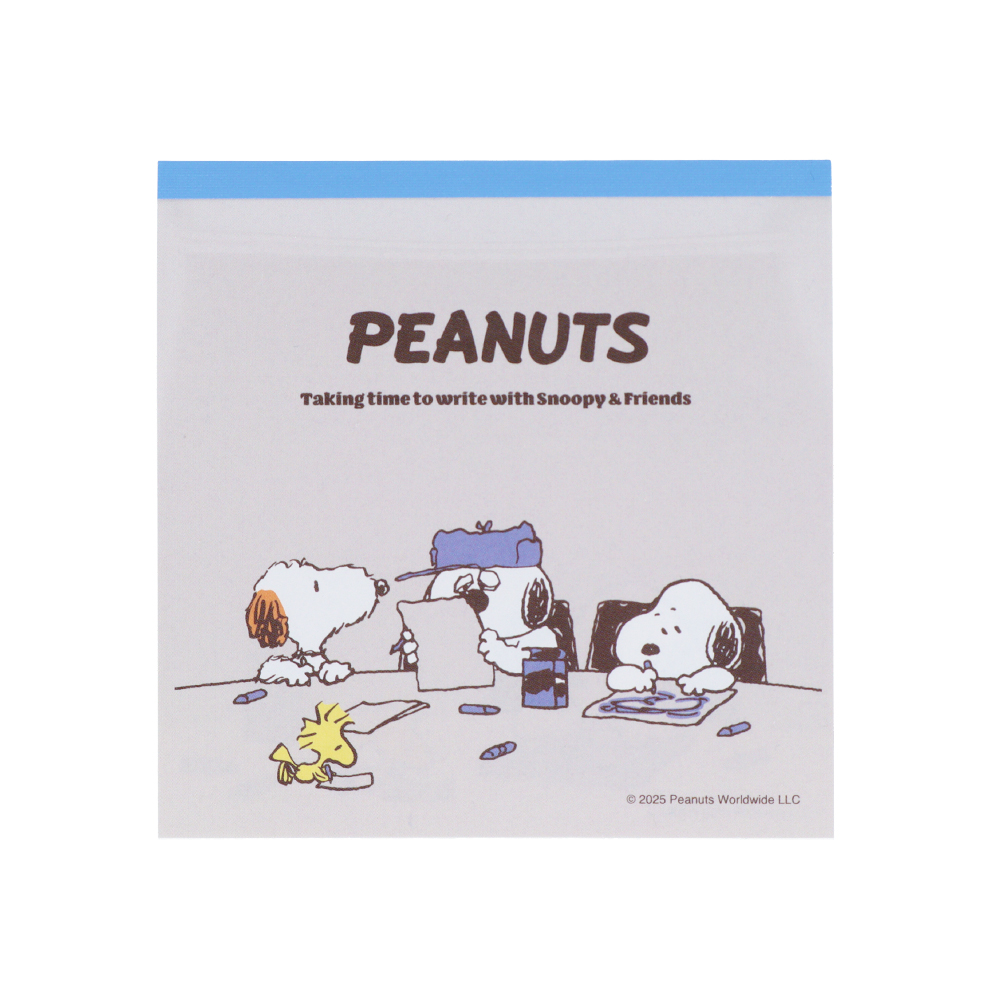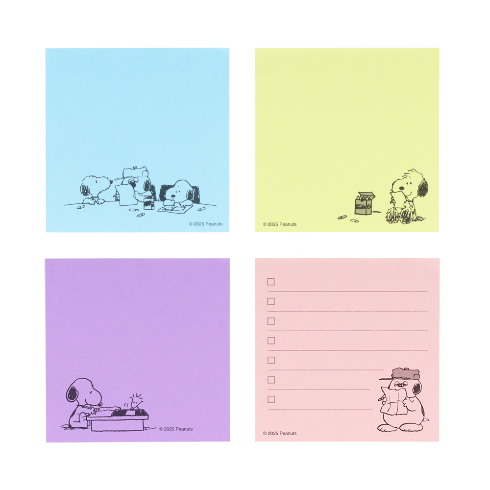 メモには「スヌーピー」や「ウッドストック」たちがお手紙を描くシーンが様々なシチュエーションで描かれています。