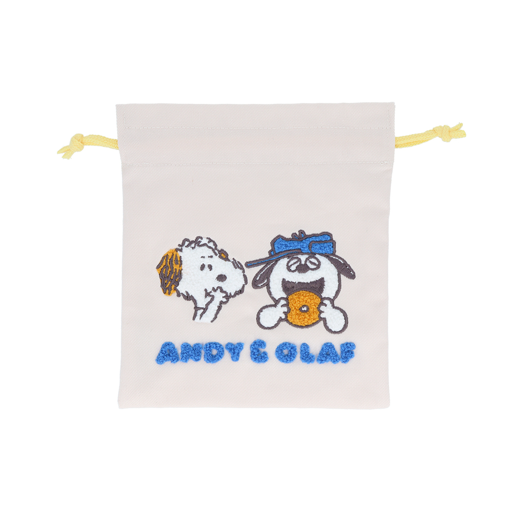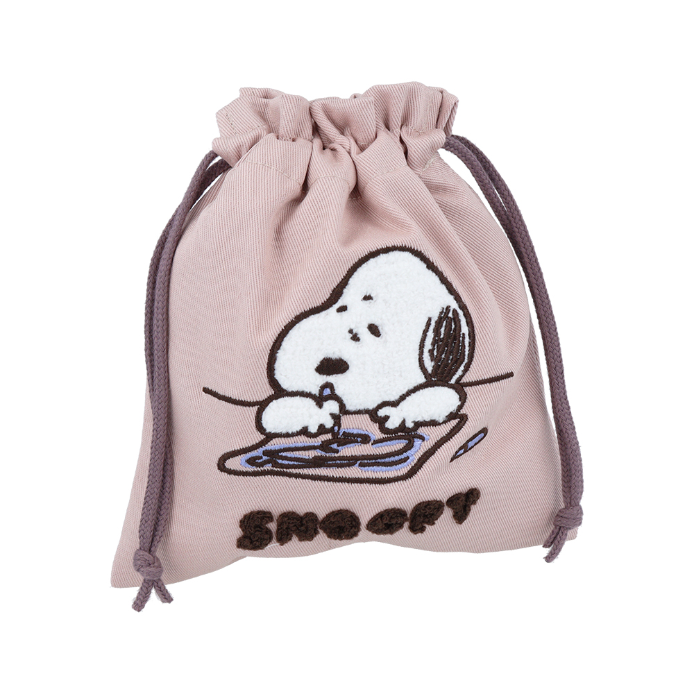 キャラクターやロゴにふわふわのサガラ刺繍が施された巾着。