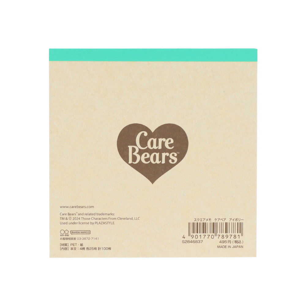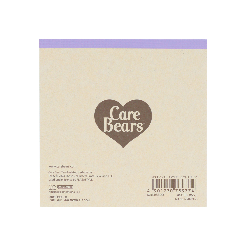 ミントグリーンの背景に、雲の上で遊ぶ「ケアベア」たちが表紙のスクエアメモ。