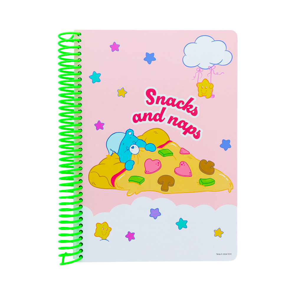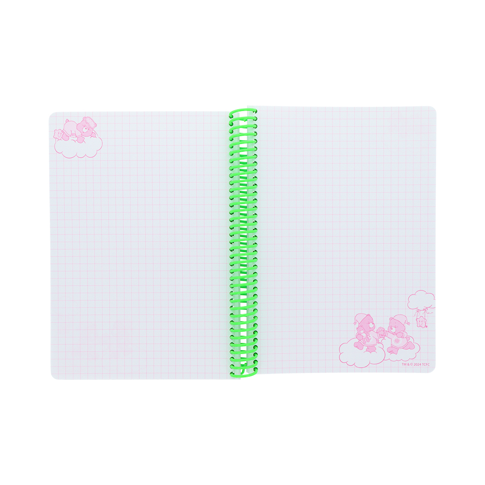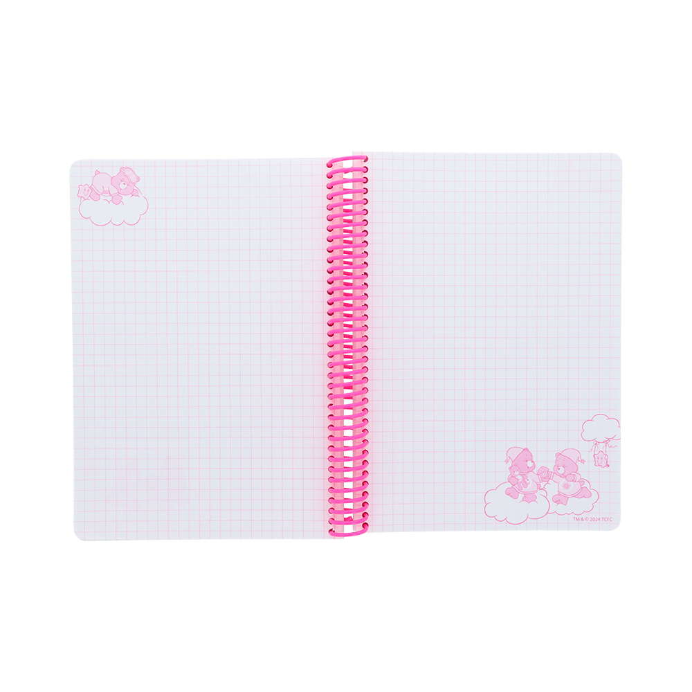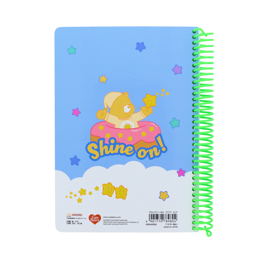 鮮やかなピンクのプラリングが目を引く、「ケアベア」デザインのノート。