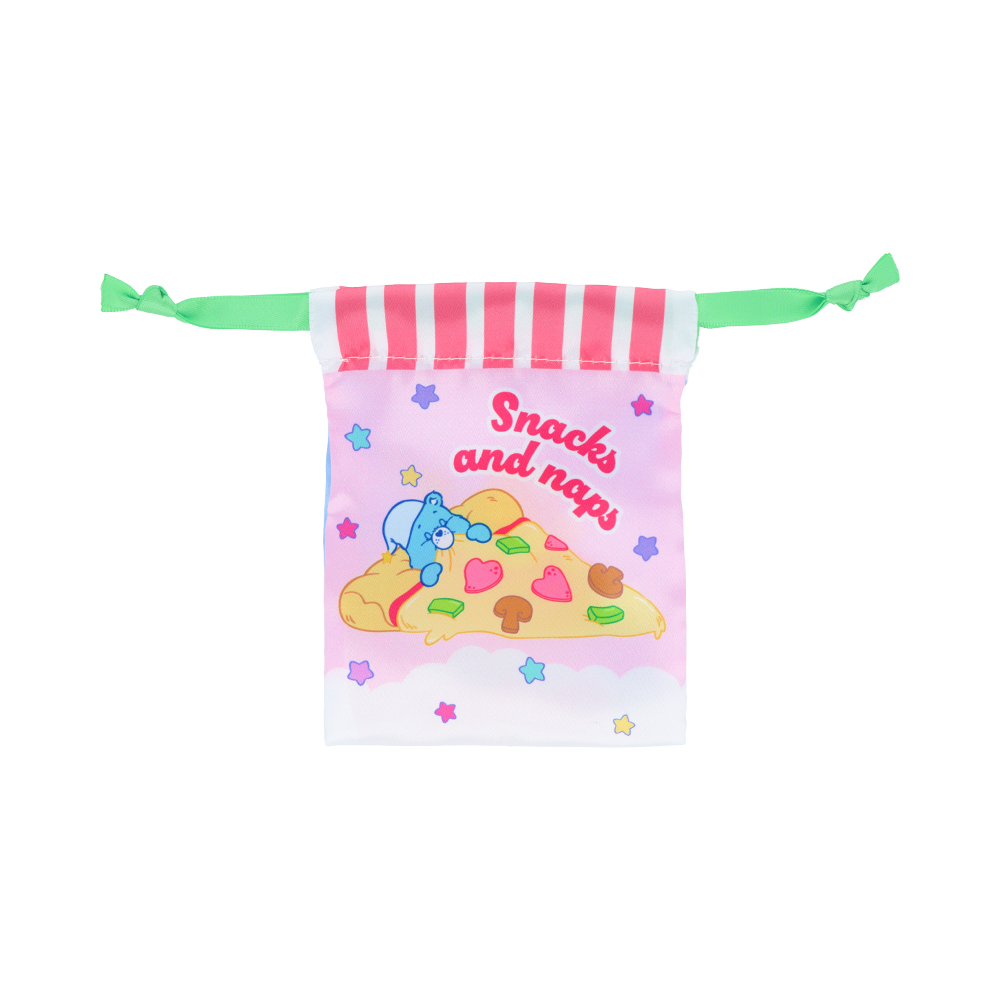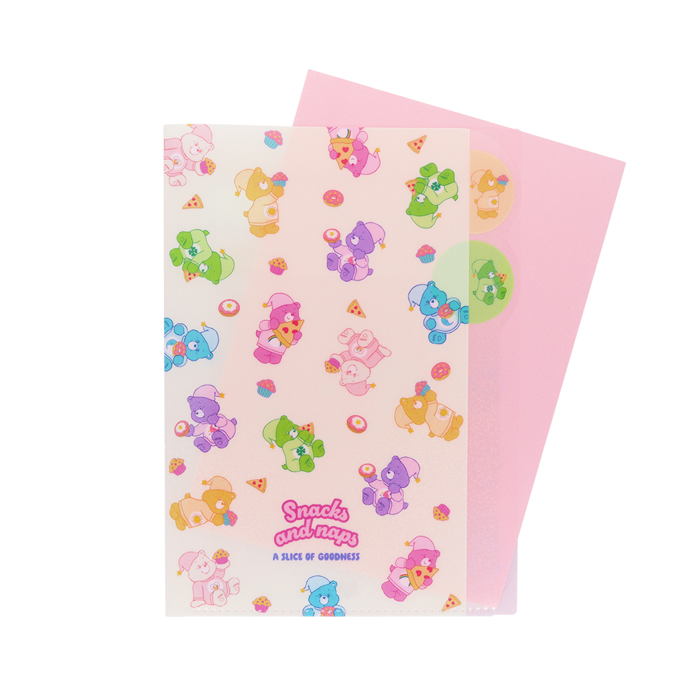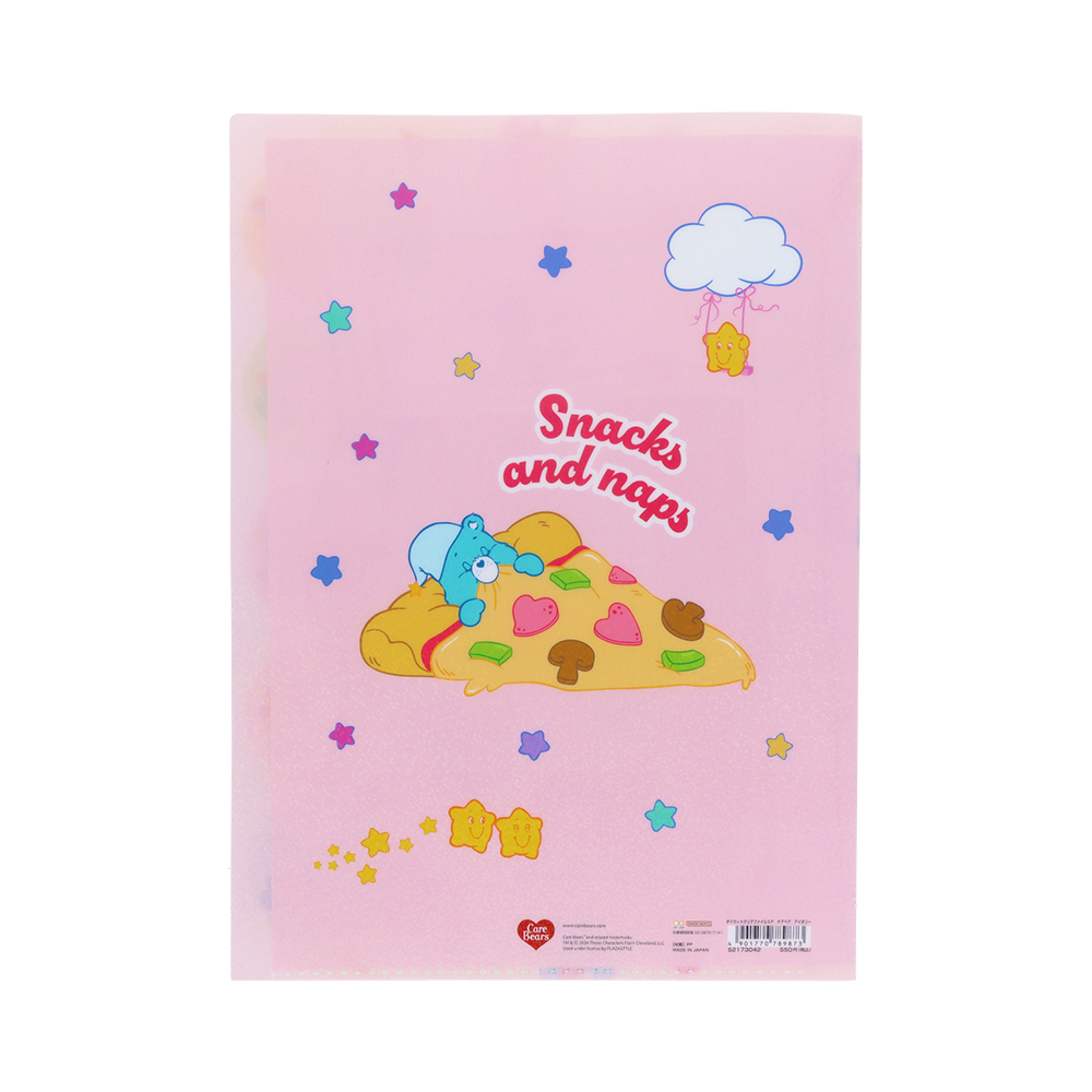 クリアファイルの裏面はピンクの背景に、ピザで眠る「ケアベア」が登場。