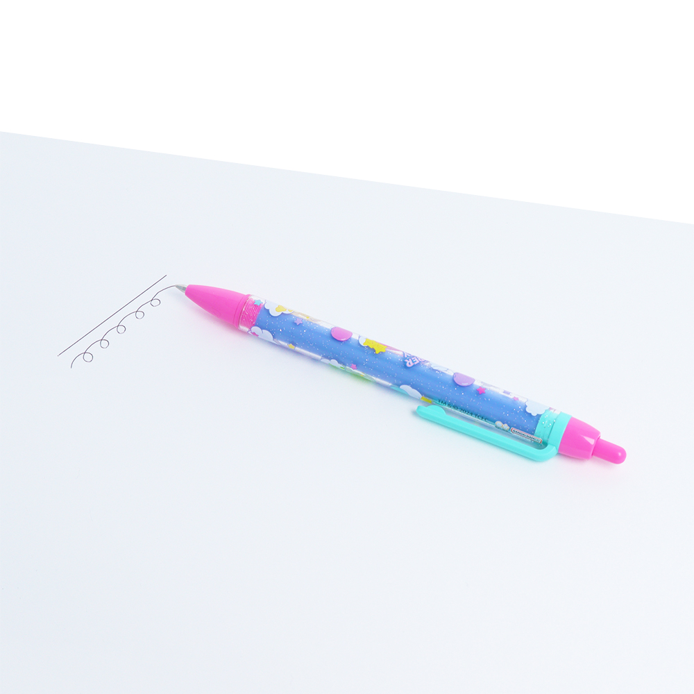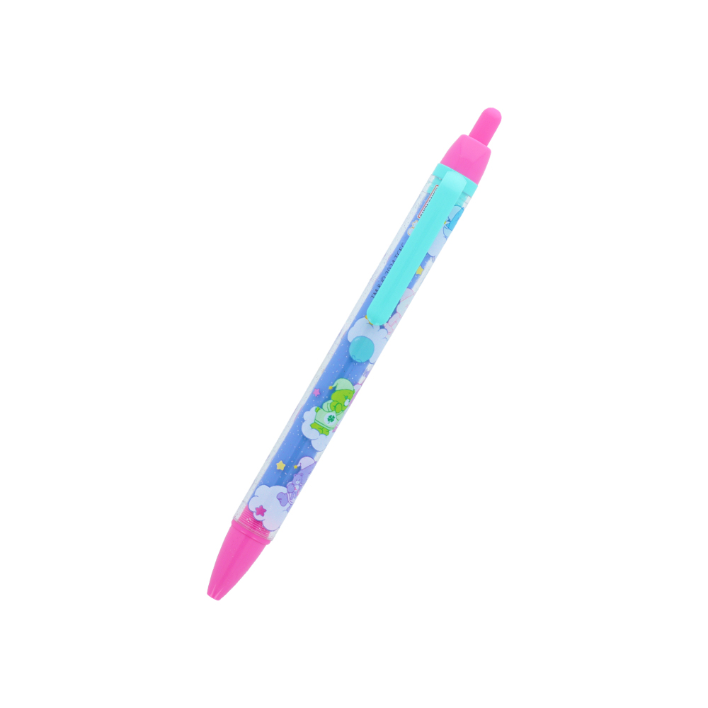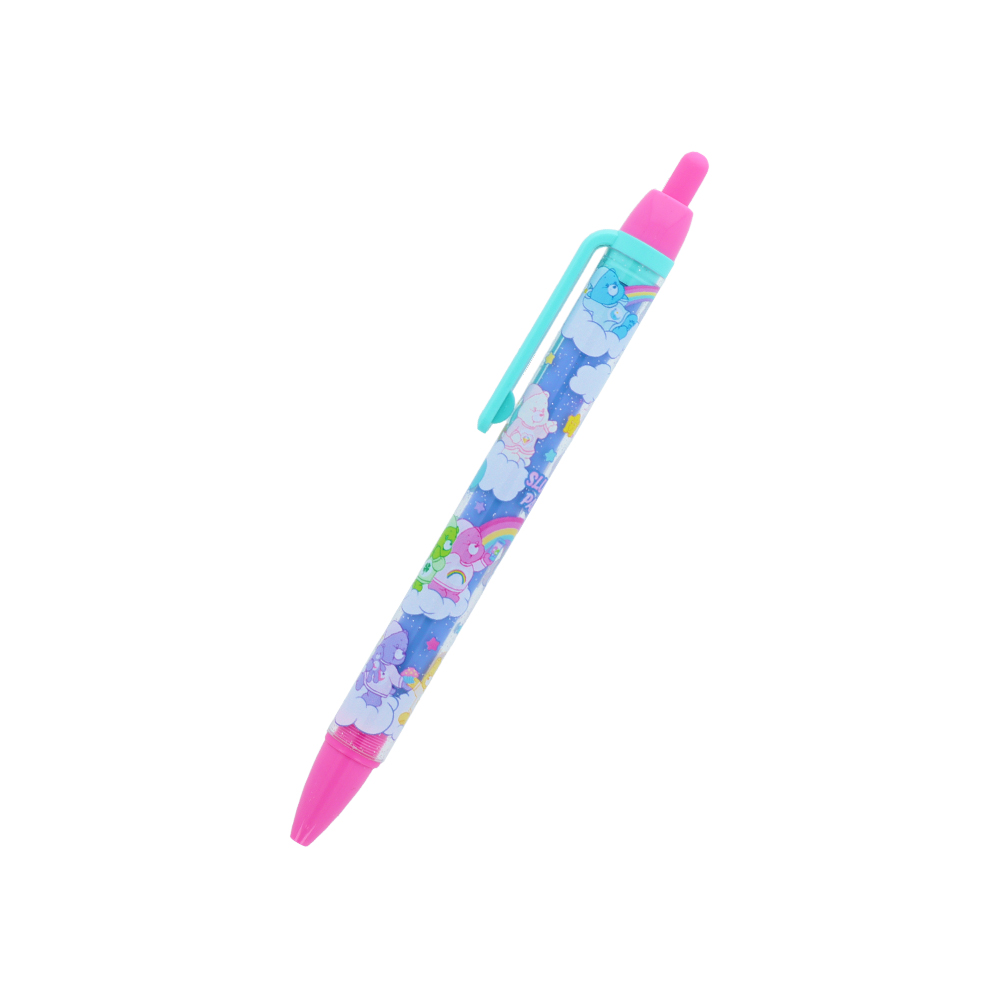 ブルーの内軸に、外軸に描かれた「ケアベア」たちが浮かび上がるボールペン。