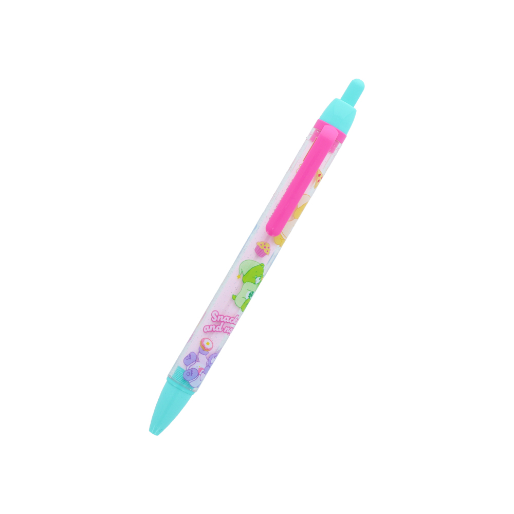 おやつを手にした「ケアベア」たちと、キラキラのクリアラメ成形が目を引くボールペン。